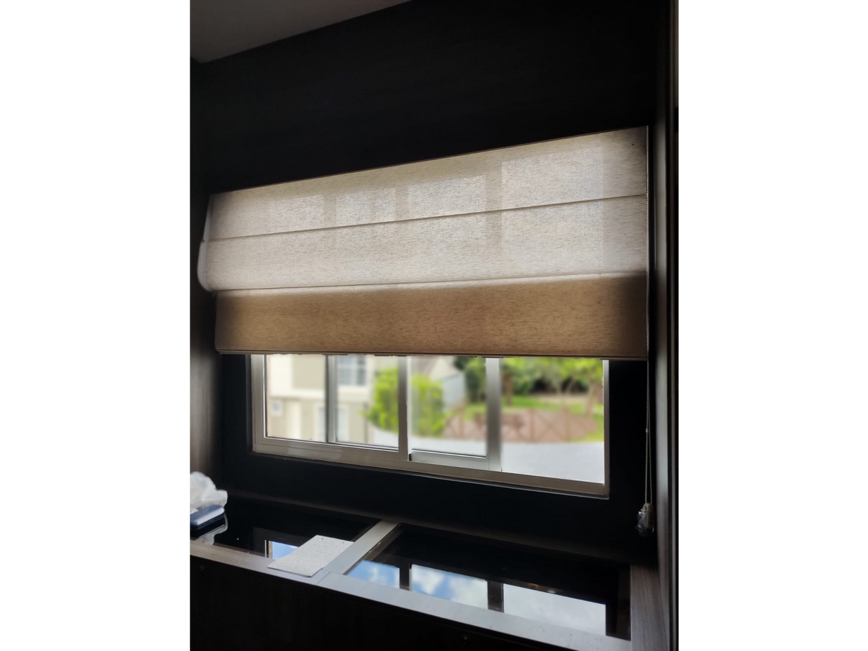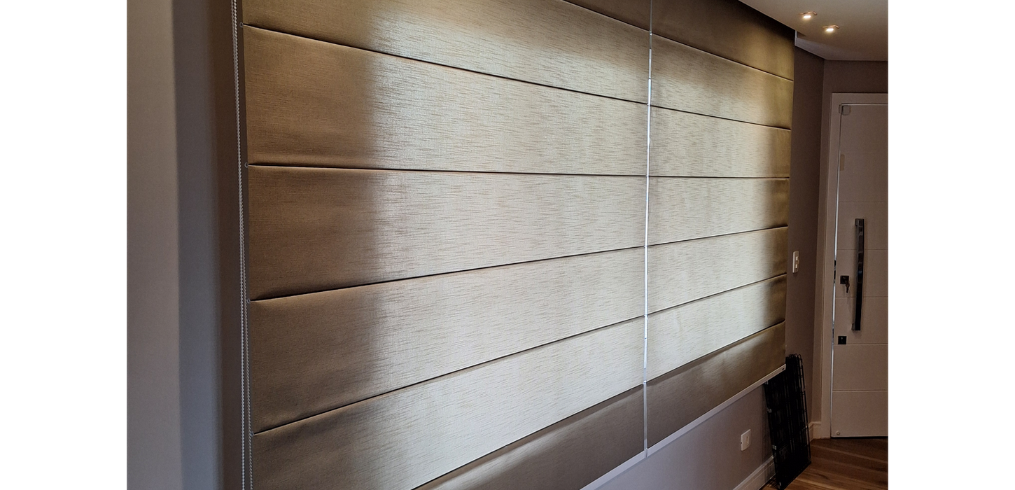A persiana romana é um modelo mais clássico e elegante. Seu sistema consiste no conjunto de varetas horizontais comandadas por fios de nylon que enrolam no cabeçote, ao enrolar o tecido se sobrepõe na parte superior.
